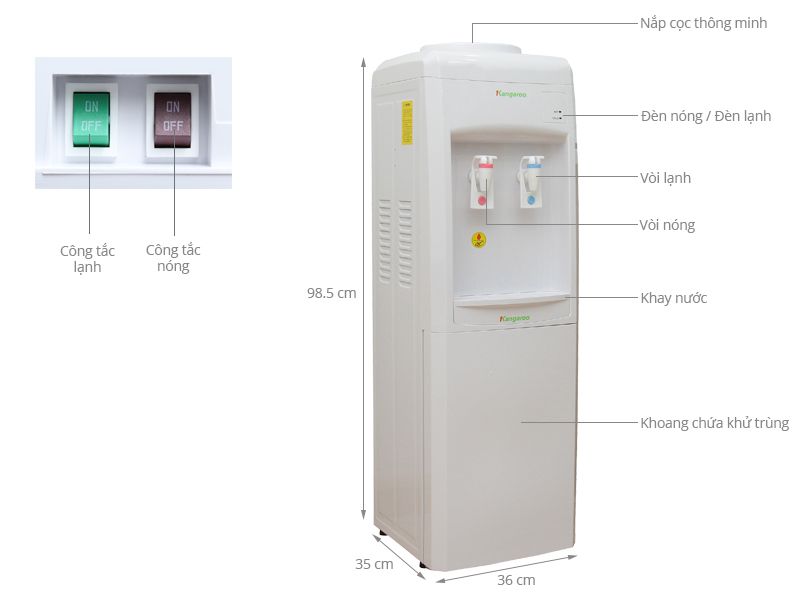 • Dễ sử dụng: Có đèn hiển thị nóng/ lạnh, dễ dàng kiểm tra trạng thái Cây nước nóng lạnh Kangaroo. 2 vòi nóng, lạnh riêng biệt.