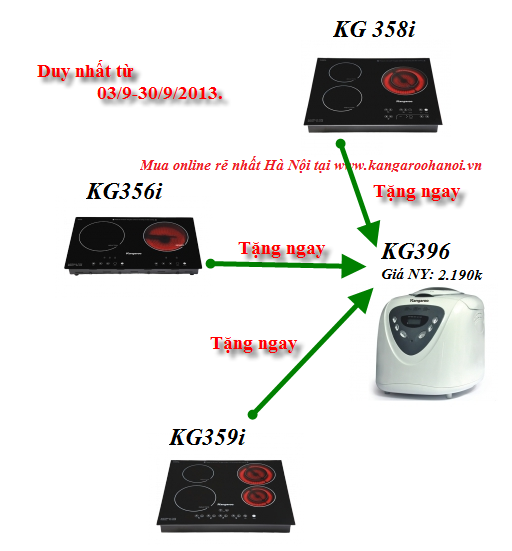 Nhân dịp chào đón Kangaroo đạt danh hiệu số 1 về ngành hàng điện gia dụng, KangarooHanoi xin gửi tới Quý khách hàng 27 ngày khuyến mại duy nhất trong năm, chỉ từ ngày 03/9 đến hết ngày 30/9 khi Quý khách hàng mua bất kỳ một trong những sản phẩm sau đây sẽ được tặng ngay 1 máy làm bánh mỳ Kangaroo KG396 trị giá lên đến 2.190.000 VND. (Sản phẩm khuyến mại được tặng ngay khi giao hàng.)