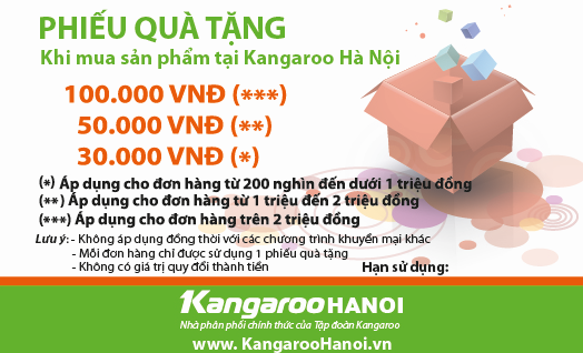 • Đối với khách hàng khi mua bất kỳ sản phẩm nào tại Kangaroohanoi.vn đều được tặng phiếu quà tặng trị giá từ 30.000VND đến 100.000VND. Số phiếu quà tặng được nhận sẽ phụ thuộc vào giá trị đơn hàng mua. (Phiếu này có thể cho, tặng lại cho bạn bè, người thân)