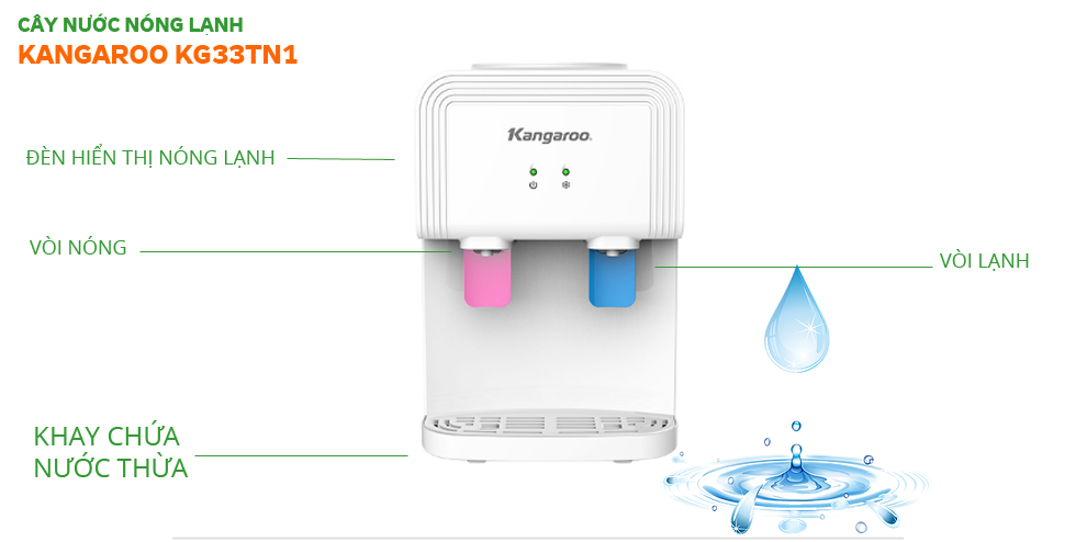 Cây nước nóng lạnh Kangaroo KG33TN1 có hệ thống làm lạnh bằng vi mạch và chip điện tử. Nhiệt độ bên nóng có thể đạt đến 90 độ C, thuận tiện pha trà, pha cà phê, thậm chí là nấu mỳ, tiết kiệm thời gian. Thân màu trắng, vòi nóng màu hồng, vòi lạnh màu xanh bắt mắt. Kiểu dáng gọn nhẹ, có thể đặt ngay trên bàn bếp. Màn hình LED hiển thị chức năng, sang trọng hiện đại.