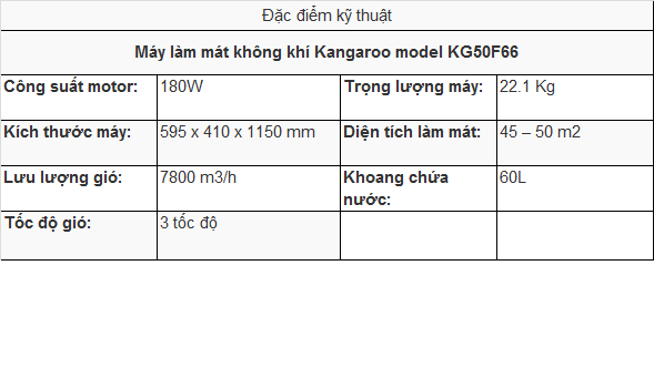 Chế độ làm mát: 3 tốc độ quạt gió, gồm thấp – trung bình – cao với thiết kế dàn bay hơi kiểu tổ ong làm tăng lượng không khí giúp tạo ra luồng gió mát mẻ, dễ chịu. Với công suất 180W và lưu lượng gió đạt 7800m3/h, Máy làm mát không khí Kangaroo KG50F66 phù hợp với không gian có diện tích 45 – 50m2.