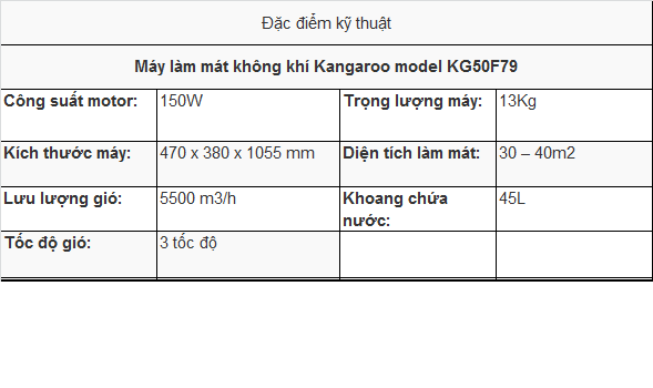 Với công suất 150W và lưu lượng gió đạt 5500m3/h, máy làm mát không khí Kangaroo KG50F79 phù hợp với không gian có diện tích từ 30- 40m2.