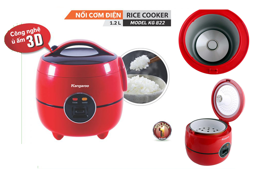 Nồi cơm điện Kangaroo KG822 là Nồi cơm điện dạng cơ, có dung tích 1.2 lít, phù hợp với các hộ gia đình ít người (2 đến 3 người). Nồi có màu đỏ bắt mắt, công nghệ giữ ấm tiên tiến 3D giúp cơm được nóng mà tiêu thụ ít điện năng.