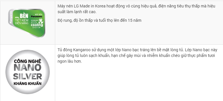 Tủ đông kháng khuẩn Kangaroo KG266NC2 được trang bị máy nén LG made in Korea giúp sản phẩm vận hành êm ái, tốc độ làm lạnh nhanh, tiết kiệm điện năng lên đến 50%. Bên cạnh đó, tủ đông Kangaroo còn được tráng một lớp Nano bạc lên bề mặt lòng tủ, công nghệ Nano bạc này giúp lòng tủ luôn sạch khuẩn, hạn chế gây mùi và nhiễm khuẩn chéo giữ thực phẩm tươi ngon lâu hơn.