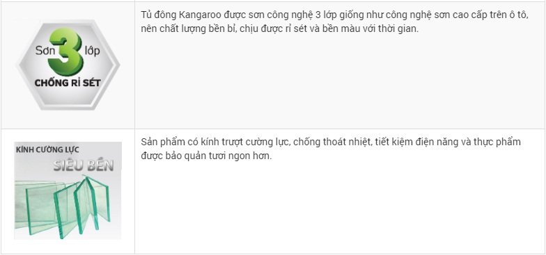 Thiết kế tủ đông với kiểu dáng nhỏ gọn, được sơn phủ 3 lớp chất lượng bền bỉ, chịu được rỉ sét và bền màu theo thời gian. Đặc biệt tủ đông Kháng khuẩn Kangaroo còn được trang bị tính năng xả tuyết bán tự động, chỉ cần nhấn và chờ 30 phút là tủ hoàn toàn sạch tuyết, dễ dàng bảo quản thực phẩm mới hợp vệ sinh và sạch sẽ sau một thời gian sử dụng.
