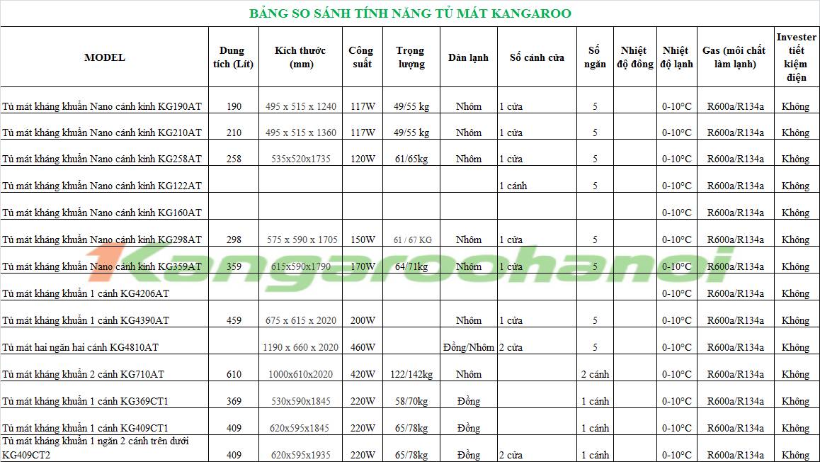 Bảng so sánh các model Tủ mát Kangaroo