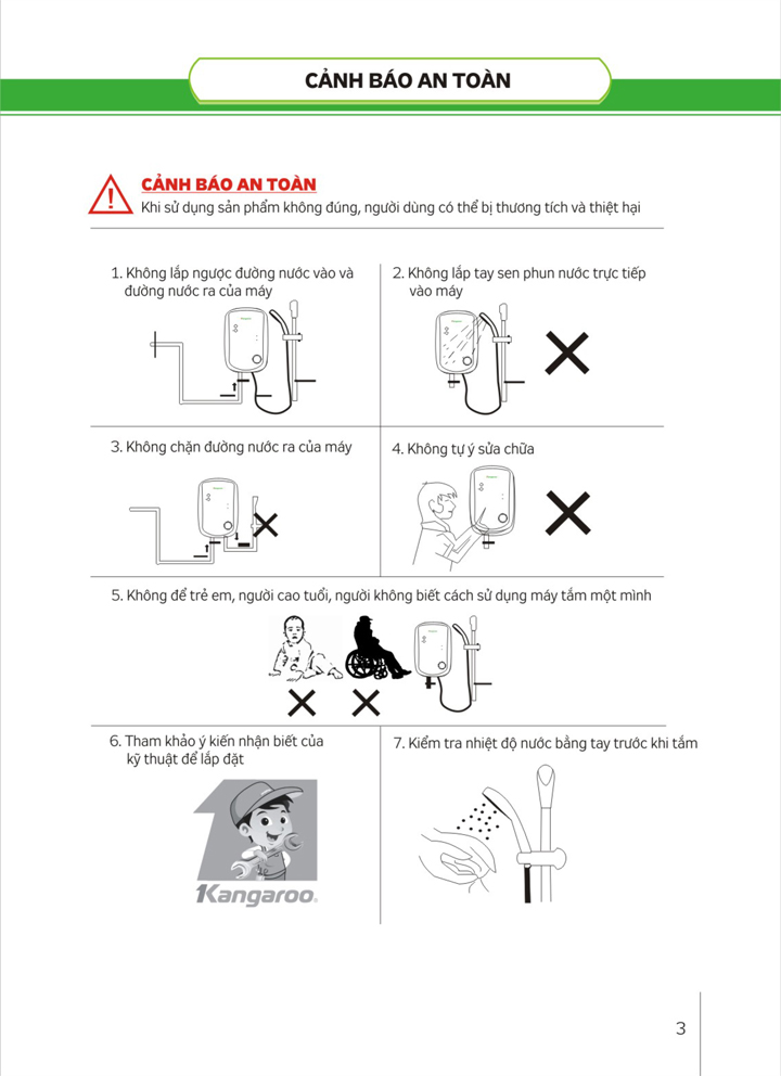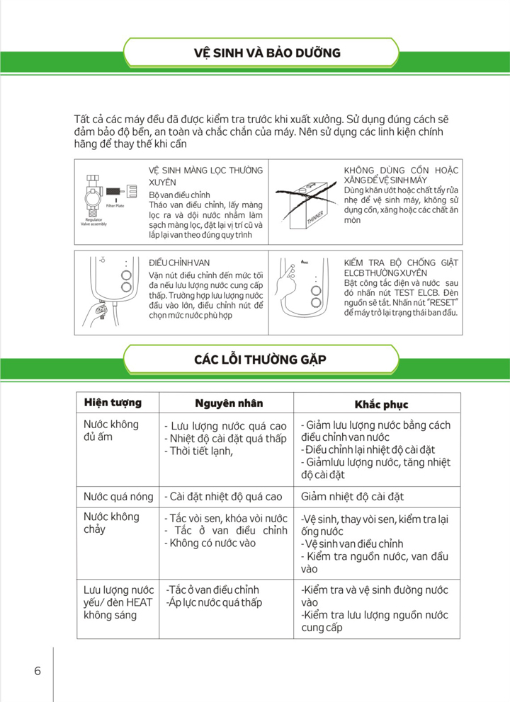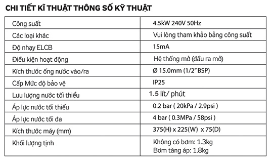 • Lưu lượng nước tối thiểu: 1,5 Lít/phút
