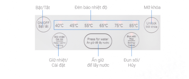 Bạn có thể tùy chỉnh thời gian đun sôi lại nước. Trong quá trình giữ ấm nước, nếu thấy nhiệt độ nước không đủ yêu cầu sử dụng, bạn có thể nhấn vào nút “Tự đun sôi lại – Reboil”, bình sẽ tự động đun sôi lại nước.