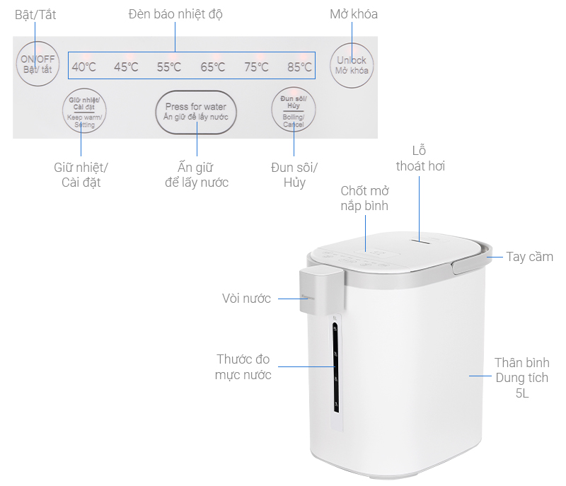Giữ ấm nước ở 6 cấp độ nhiệt và 8 chế độ nước