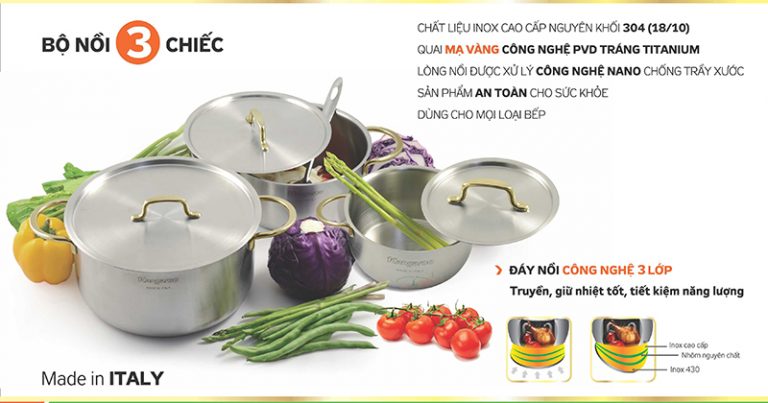 Bộ nồi inox Kangaroo KG183 được làm bằng chất liệu inox cao cấp nguyên khối 304 (18/10). Inox 304 có nhiều ưu điểm như có khả năng chịu nhiệt cao, độ cứng và độ bền cao, chống chịu ăn mòn cao, độ dẻo dai ở nhiệt độ thấp và không han rỉ. Nhờ những đặc tính này, Kangaroo đã nghiên cứu và ứng dụng chất liệu inox 304 vào bộ nồi inox Kangaroo KG183 đảm bảo cung cấp sản phẩm chất lượng tốt nhất cho người tiêu dùng.