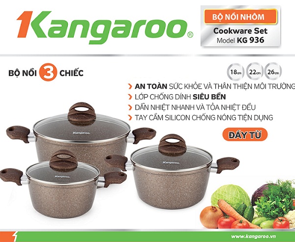 Bộ nồi nhôm đáy từ Kangaroo KG936 làm từ chất liệu nhôm có khả năng gia truyền nhiệt nhanh, hấp thu nhiệt tốt, làm thức ăn nhanh chín, giúp bạn tiết kiệm thời gian trong việc nấu nướng.