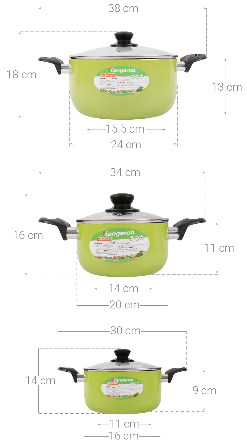 Bộ nồi nhôm Kangaroo KG993MX gồm 3 nồi với các kích thước khác nhau như nồi 16 cm, 20 cm, và 24 cm. Với màu xanh lá mạ rực rỡ, bộ nồi giúp tô điểm thêm cho không gian bếp hiện đại và thể hiện rõ gu thẩm mỹ của gia chủ.