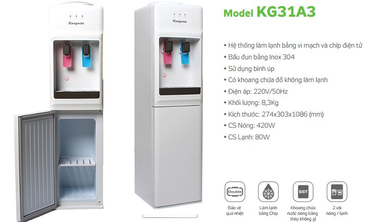 Cây nước nóng lạnh Kangaroo KG31A3 là một trong các sản phẩm bán chạy của dòng cây nước liên doanh. Sản phẩm có hệ thống làm lạnh bằng chip điện tử, thiết kế hai vòi nóng lạnh riêng biệt (vòi nóng màu đỏ, vòi lạnh màu xanh). Thân màu trắng trang nhã, thích hợp đặt ở các vị trí khác nhau trong nhà.