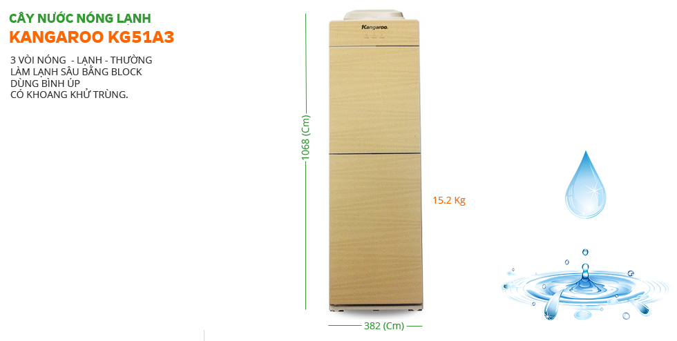 Cây nước nóng lạnh Kangaroo KG51A3 có hệ thống làm lạnh bằng block làm lạnh sâu và độ bền cao. Sản phẩm thuộc dòng Cây nước nóng lạnh Kangaroo liên doanh, dạng cây đứng, thiết kế ba vòi với các chức năng nóng - lạnh - thường riêng biệt, linh hoạt khi sử dụng. Kiểu dáng sản phẩm khá lạ mắt, màu nâu kết hợp vân gỗ.