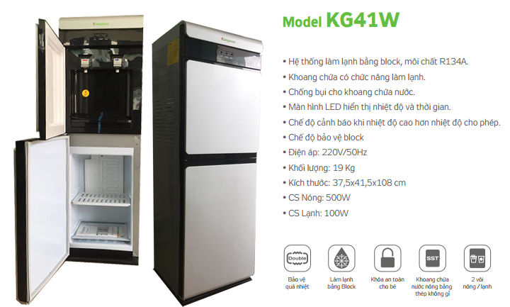 Cây nước nóng lạnh Kangaroo KG41W thuộc dòng sản phẩm liên doanh. Sản phẩm có hệ thống làm lạnh bằng Block, lạnh sâu đến 4 độ C, dung tích bình chứa nước lạnh 2 lít. Bên nóng đạt 95 độ C, dung tích 5 lít. Có cánh cửa tủ ngăn bụi bẩn khi không sử dụng.