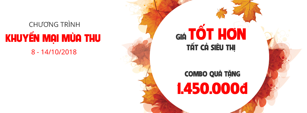 Chương trình khuyến mại chào mừng mùa thu 2018 diễn ra từ 8 - 14/10/2018 với các nội dung như: Giảm sốc đồng loạt từ 35 - 50%, các gói quà tặng trị giá đến 1.450.000đ cùng hàng ngàn sản phẩm khuyến mại.
