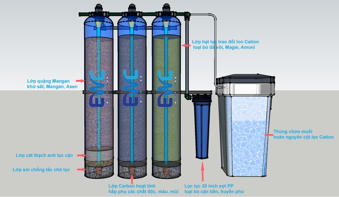 - Lọc nước nhiễm tổng thể cả phèn sắt, Mangan, Asen, Chất hữu cơ, nước cứng.