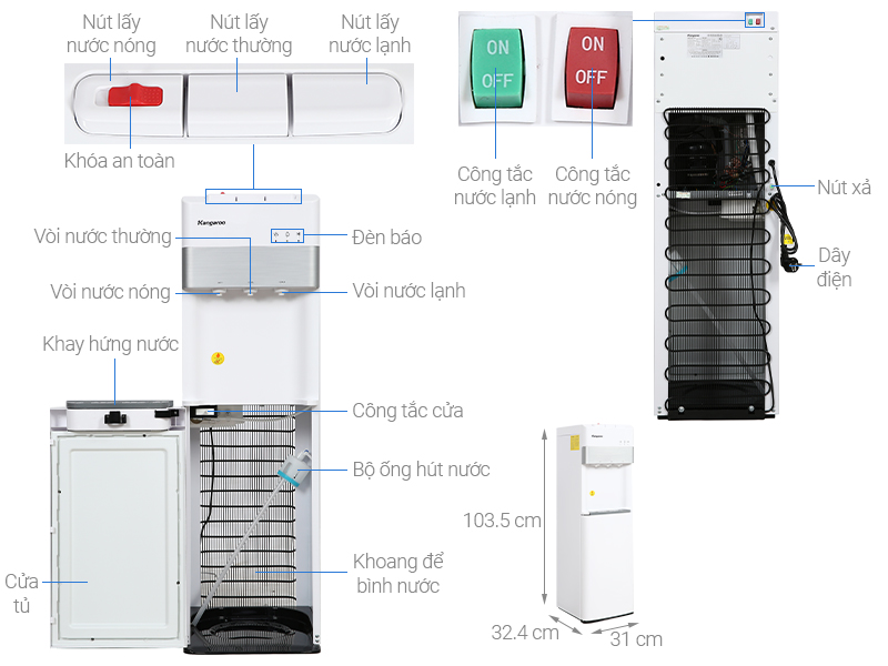 Được trang bị 3 vòi riêng biệt, với 3 chế độ nước Nóng – Lạnh – Thường, giúp cây nước nóng lạnh Kangaroo KG56A3 rất dễ dàng sử dụng, thỏa mãn mọi nhu cầu dùng nước của bạn, dù nước ấm buổi sáng, nước lạnh để giải khát hay nước nóng để pha chế đồ uống.