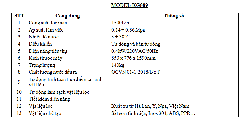 - Với cấu hình lắp đặt và vật liệu lọc, máy lọc tổng có thể lọc được nguồn nước bị ô nhiễm vượt quá tiêu chuẩn QCVN01-1:2018, nước sau khi được xử lý qua máy lọc tổng KG889 đảm bảo theo tiêu chuẩn QCVN01-1:2018