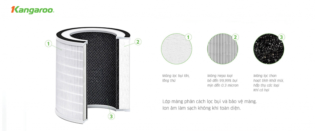 Máy lọc không khí Kangaroo KG50AP được thiết kế với màng lọc trụ tròn độc đáo kích thước lớn. Sản phẩm trang bị đến 6 cấp độ lọc bao gồm Màng lọc thô – Màng lọc bụi lớn – Màng HEPA – Màng lọc than hoạt tính – Đèn UV Led – Ion âm, lọc sạch không khí và loại bỏ đến 99% bụi mịn, loại bỏ tối đa vi khuẩn có kích thước cực nhỏ, nấm mốc gây mùi khó chịu có trong không khí, trả lại bầu không khí trong lành, sạch khuẩn và đảm bảo sức khỏe cho cả gia đình bạn.