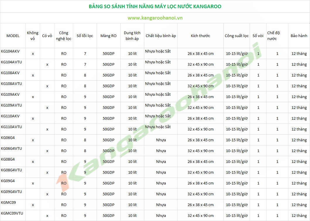 Bảng so sánh các model Máy lọc nước Kangaroo