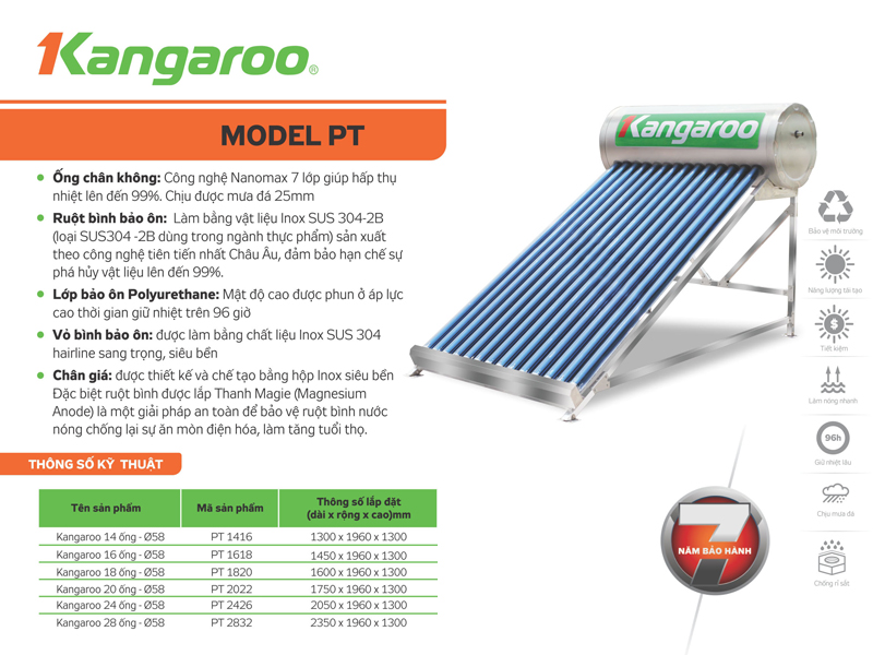 Máy nước nóng năng lượng mặt trời kháng khuẩn Kangaroo Model PT được trang bị ống chân không 7 lớp được trắng bằng công nghệ Nanomax giúp làm nóng nước nhanh hơn với khả năng hấp thụ nhiệt lên đến 99%, chịu được mưa đá 25mm. Máy cũng được trang bị thanh magie chống bám cặn cho ống và bình bảo ôn.