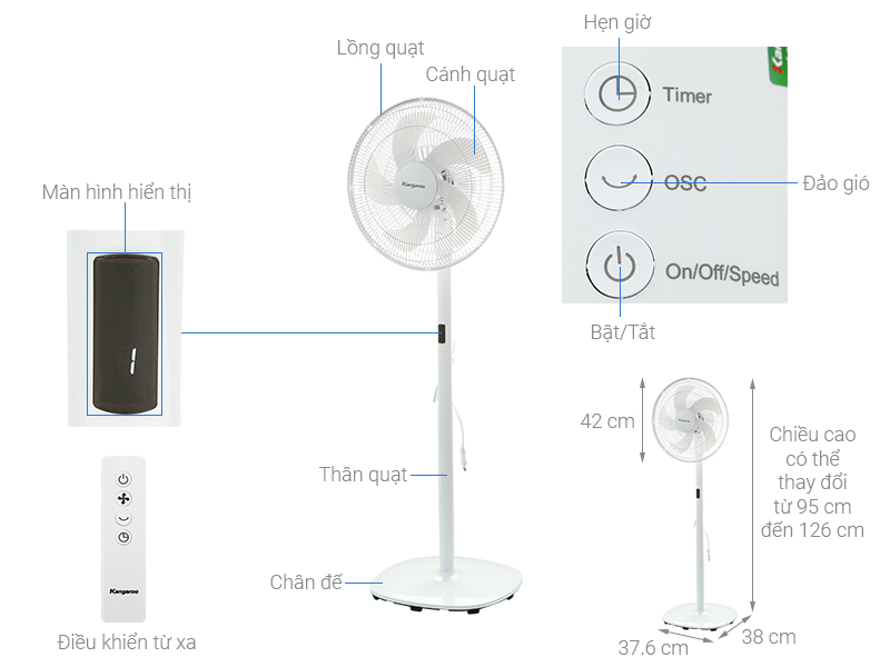 Quạt Kangaroo KG726 sử dụng nút bấm tiện lợi, và cũng được trang bị điều khiển từ xa giúp dễ dàng điều chỉnh tại nhiều nơi mà không cần di chuyển. Người dùng có thể đặt hẹn giờ bật/tắt lên đến 8 tiếng tiện lợi. Màn hình LED hiển thị rõ ràng, dễ quan sát các chế độ.