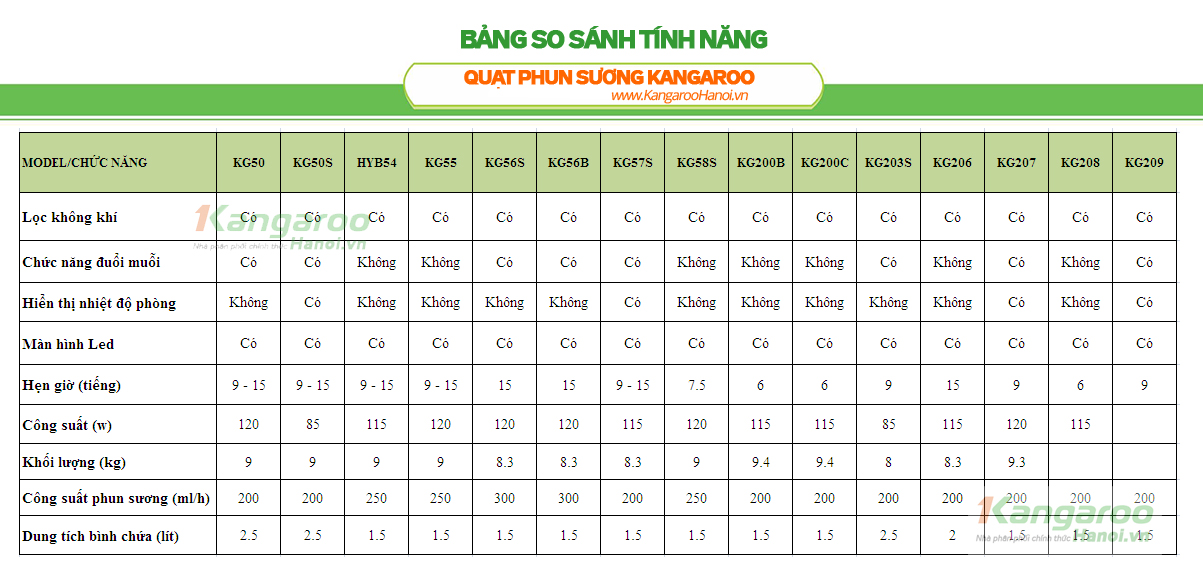 3. Bảng so sánh tính năng các model quạt phun sương Kangaroo 2016
