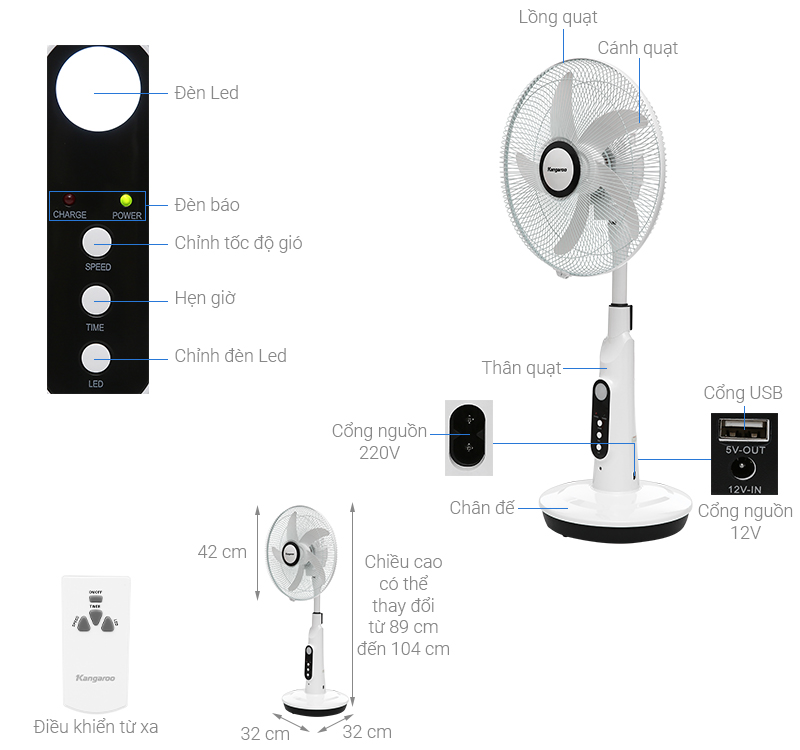 KG738 trang bị điều khiển từ xa tiện lợi, người dùng dễ dàng điều chỉnh chức năng mà không cần di chuyển. Quạt sạc điện của Kangaroo có chế độ hẹn giờ 30 phút giúp bạn lựa chọn thời gian hoạt động đơn giản.