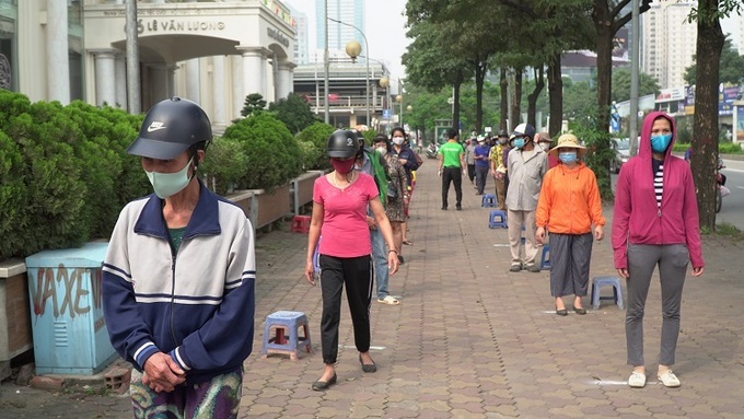 Người dân đều đứng xếp hàng giãn cách 2m.